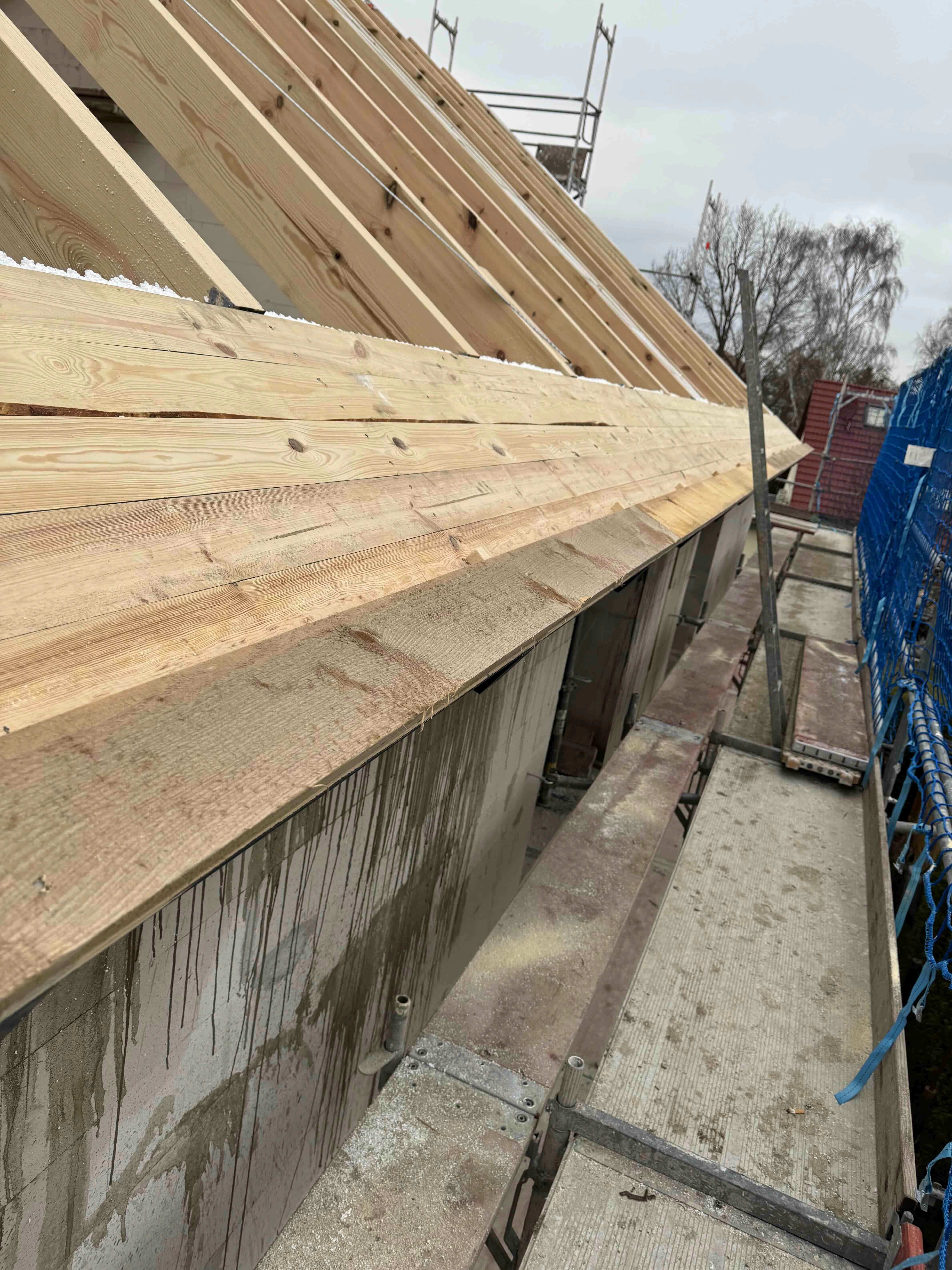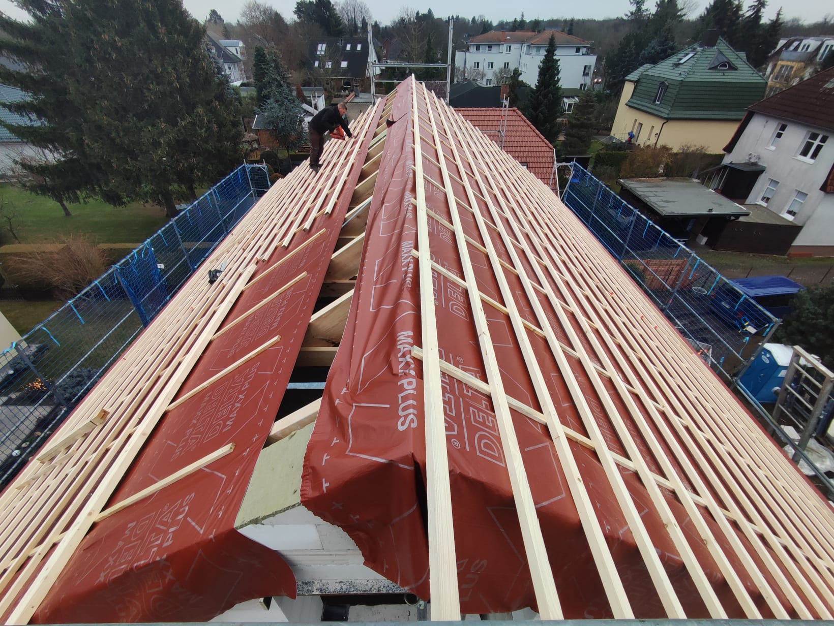 Die Unterkonstruktion wurde sorgfältig überarbeitet und für die energetische Modernisierung vorbereitet – inklusive neuer Lattabstände, notwendiger Reparaturen am Holztragwerk und sauberer Ausbildung der Traufe.